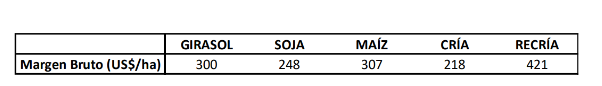 Frente a estas alternativas agrícolas, la cría vacuna en la zona, con una carga de 1,1 vacas por hectárea y 182 kilos de producción de carne por hectárea, proyecta un margen bruto de 218US$/ha. Este valor se ubica por debajo de las tres alternativas agrícolas, pero puede complementarlas aprovechando los rastrojos y además tiene el beneficio de su mayor probabilidad de obtener el resultado previsto si sobreviene un evento La Niña con menores lluvias, como se pronostica para la primavera y el verano.