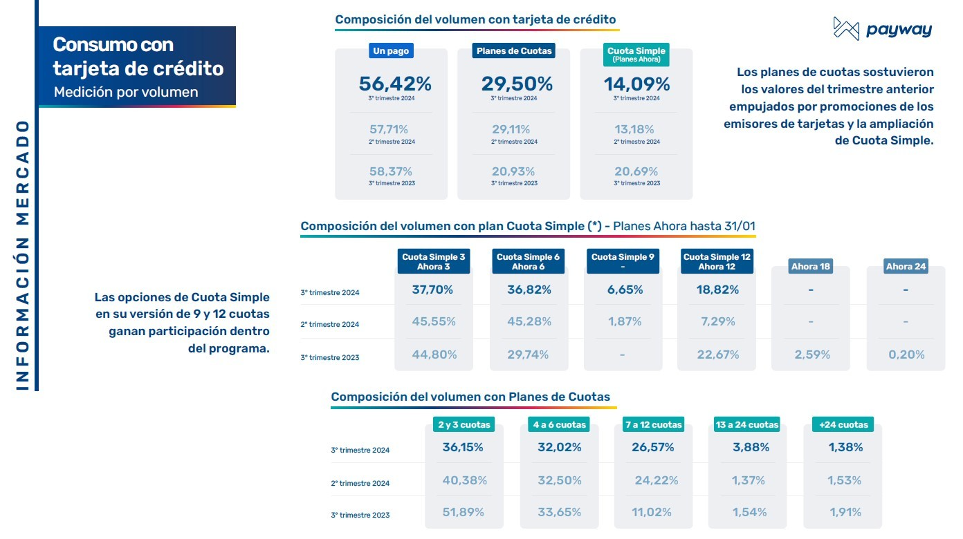 En el análisis del consumo con tarjeta de crédito se visualiza que los planes de cuotas sostuvieron valores del trimestre anterior empujados por promociones de los emisores de tarjetas y la ampliación del Cuota Simple, cuyas versiones de 9 y 12 cuotas ganan participación dentro del programa.