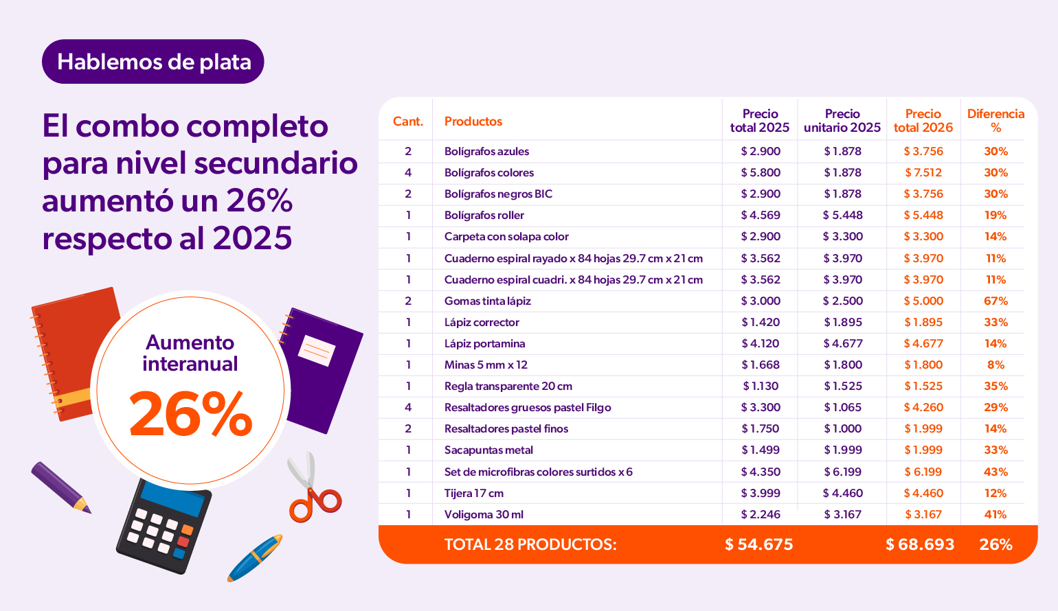 A pocas semanas de la vuelta a clases 2026, el blog de Naranja X, Hablemos de Plata, publicó un relevamiento exclusivo que elaboró por la consultora Focus Market. Sobre la evolución de precios de una canasta de productos que incluye útiles, mochilas, guardapolvos y artículos de tecnología.